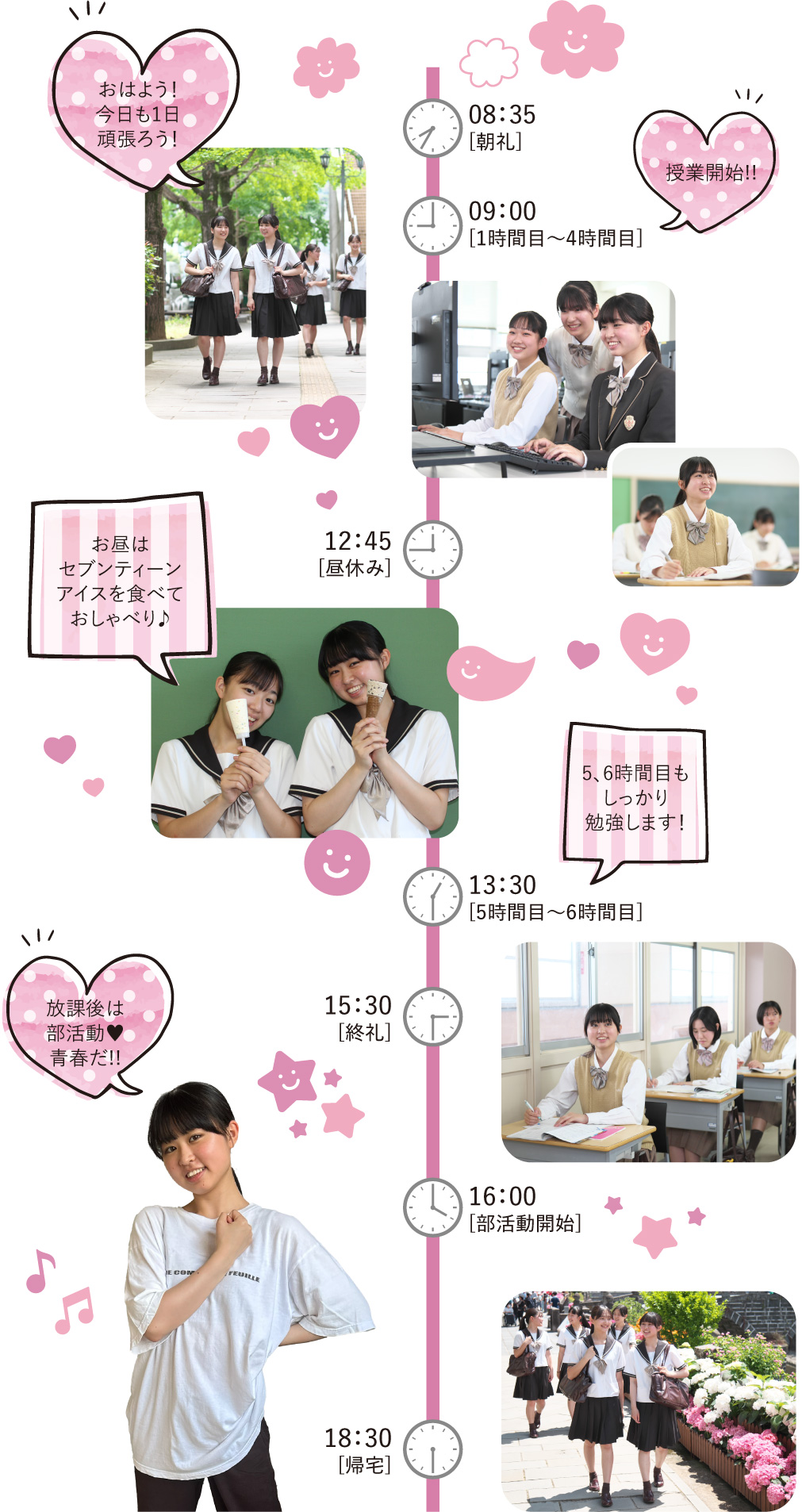 学校生活 生徒の一日 A day in the life of a student スーパーライセンス系列在校生の池内さん 女子商業高校で毎日楽しく過ごしています!朝は登校して授業の準備、簿記などの専門科目にしっかり取り組みます。体育ではバスケで思いっきり体を動かしてリフレッシュ!お昼には友達とアイスを食べてほっとひと息。放課後はダンス部で仲間と汗を流し、友達や後輩もたくさんできて、毎日が充実しています!